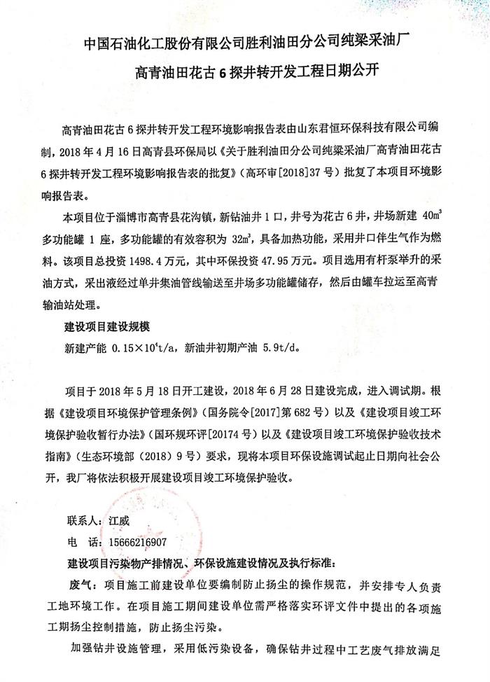 中國石油化工股份有限公司勝利油田分公司純梁采油廠高青油田花古6探井轉(zhuǎn)開發(fā)工程日期公開
